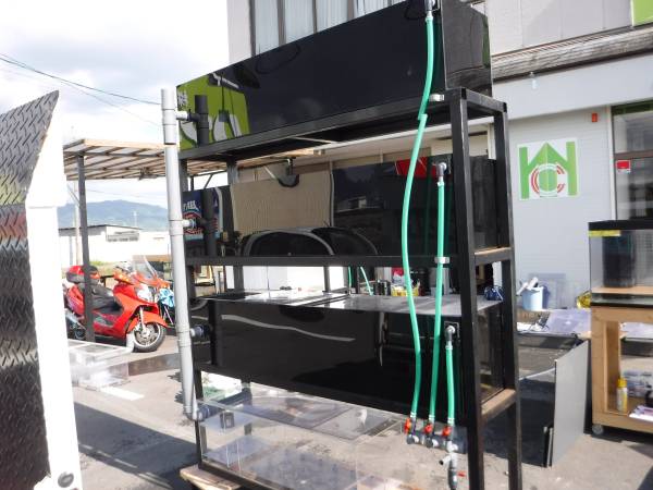 | 仕様: | 水槽=W1200×D600×H450 4面ブラック 8㎜ 付属品 台 木製 H800 濾過槽 W1170×D200×H230 |