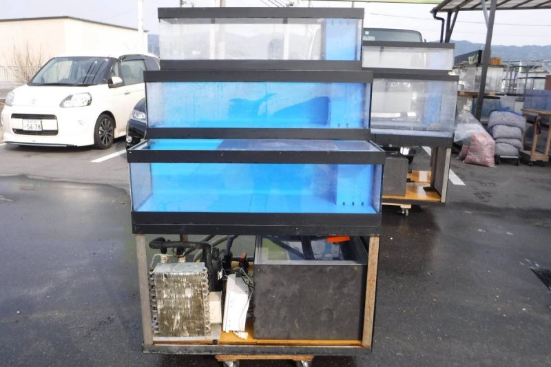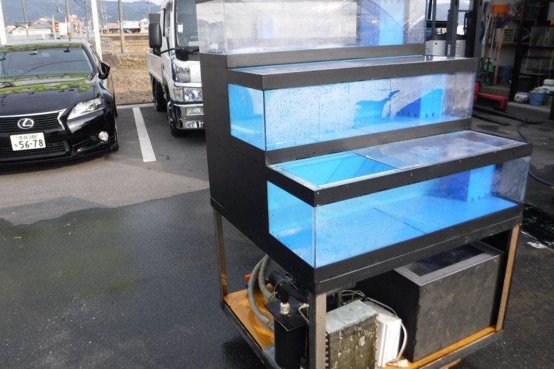 | 仕様: | 全体サイズ W1000×D900×H1500 【活魚用水槽】 水槽=W1000×D300×H300 の水槽が3段 付属品 台/濾過槽/ポンプ/クーラー |